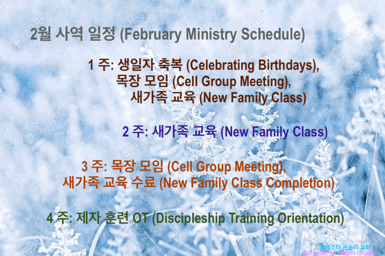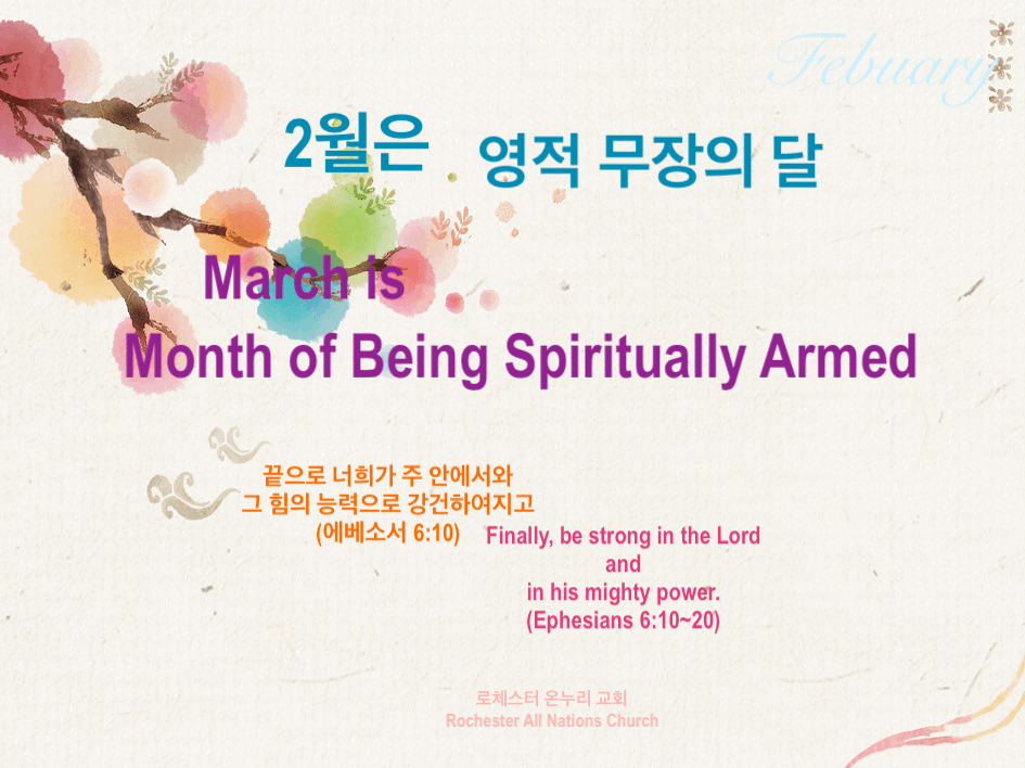 2023 2월은 영적무장의 달 Publish on February 24,2023 | 온누리교회 페이지 정보 작성자 온누리교회 댓글 0건 조회 2,046회 작성일 23-02-24 18:52 목록 본문 2023 2월은 영적무장의 달 이전글2023 3월은 영적도전의 달 23.03.11 다음글2023 1월은 영적 결심의 달 23.01.03 댓글 0 댓글목록 등록된 댓글이 없습니다. 목록